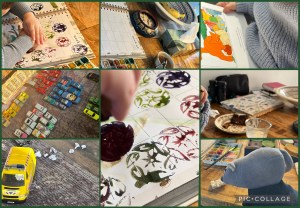 Het was weer een gevuld dagje vol autootjes al dan niet gesorteerd, geroosterde broodjes met choco-pasta en melk, Muis kwam mee-eten. De verf kwam op tafel en een batik stempel van vroeger, die verrassend goed te stempelen bleek en dat met waterverf, misschien juist door de waterverf. Als iets nieuw is, dan wil hij dat niet, maar op zo’n moment ga ik er mee aan de slag en dan wordt zijn enthousiasme voor dat onbekende gebied groter en groter en neemt hij het over. Ken uw pappenheimers. Een half uurtje Ipad werd ingecalculeerd en rijstewafelstukjes tussendoor als lekkernij. Voor de vuilniswagen maakten we kleine propjes papier, goed voor de fijne motoriek, die ook nog eens allemaal in de Dinkitoy gefriemeld moesten worden. Hij was er een tijd lang zoet mee.