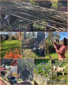 Wij waren inmiddels begonnen met de takken te slechten, die Lief nog van de twee wilgen aan de zijkant van het atelier had afgehaald. Kalm staken maken en de klein takken ruimen tot dochterlief kwam met die koek en zopie en de twee dametjes samen aan de achterkant van de tuin aan het werk gingen, terwijl ik in het zonnetje kalm doorging met snoeien, bundelen, vastbinden met wilgentwijgen en op de vuilniszakken leggen. Een mooi Zen-werkje voor mij, zonder gehijg en gepiep.