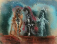 Ze hadden misschien zelf een wereld aan beleving meegemaakt. Waren los van het paneel gekomen, hadden rond gezweefd in het donkere stille atelier samen met de witte onderschilderingen van de anderen. Stille witte wieven. Er was verwarring over, want dat witten bleek niet noodzakelijk te zijn, omdat het wit transparanter was dan gedacht. Het riep in mijn beleving wel het vervreemdende effect op. Eindelijk kon de fijne kwast uit de tas komen. Met drie of vijf haren schilderen is andere koek dan het impressionistische geweld. Dat maakte, dat de avond voelde als een weldadig rusten. Zittend aan de tafel met het fijne penseel aaiden we de impressie tot leven.