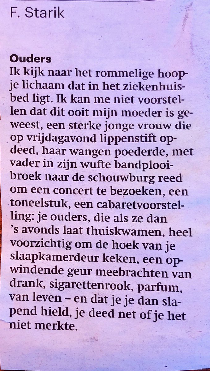 Voor een herinnering van vroeger die ik ooit geboekstaafd heb in mijn aantekeningen van een aantal jaren geleden, spitte ik hersenspinsels door. Ik zocht een stukje over mijn moeder, die zich opmaakte voor een avondje uit. Ooit had ik dat beeld gevangen in woorden. Het was naar aanleiding van Wauwel, die op Twitter een gedenkwaardig fragment uit het oeuvre van de dichter F. Starik aanhaalde. Wauwel(synoniem voor Rein Bijslma) vond dit stuk over de moeder zijn meest verpletterende stuk omdat het zo herkenbaar was. Ik moest direct denken aan mijn moeder vlak voordat ze met mijn vader uit zou gaan, terwijl ze onder het felle licht van de badkamer haar toilet maakte.