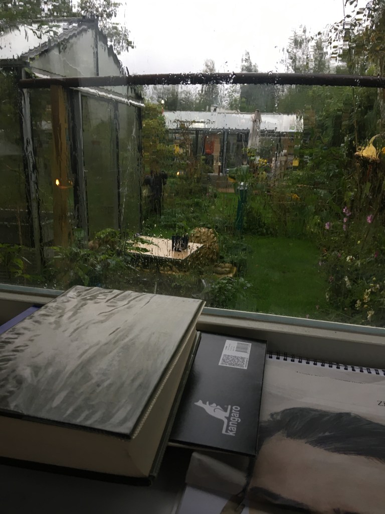 Dikke witte rook uit de schoorsteen van de oude zorgde ervoor dat het klimaat om in de tuin te werken niet optimaal was, maar hogerhand had allang bepaald, dat dat geen goed idee zou zijn. Dikke droppels vielen terwijl ik net het trapje opklom om mijn veroveringen binnen te stallen.