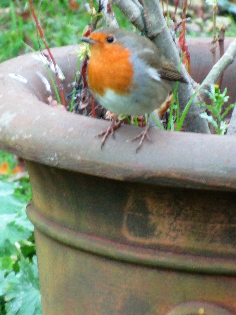 De vlier liet ik links liggen. Eerst de planten de tuin in werken. De roos kwam naast de ingang van de Bernagie, waar eerder dit jaar de springbalsemienen hadden gestaan, daarna wieden en planten. . Roodborst kwam nieuwsgierig kijken en was kennelijk zo gewend aan het idee dat ik daar rondliep, dat ze steeds dichterbij kwam. Toen ik de planten de grond aan het inwerken was, maakte ze dankbaar gebruik van de omwoelde aarde en pikte uit dat gemak haar graantjes mee. Alle werkzaamheden werden in het logboek gememoreerd. De grote waxinelichten aan, want het begon al te schemeren en voor de gezelligheid. De bollen konden later in de week gepoot worden.