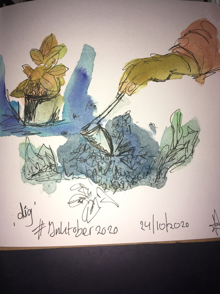 Het inktoberwoord voor vandaag was ‘dig’. Er stond niets anders op het netvliies, dan waar ik de hele middag mee bezig was geweest, dus kwam er een ietwat mislukte schepel, een wachtend plantje en rulle aarde. Beetje onduidelijk, bleek naderhand. Meer zat er niet in. Vermoeidheid dirigeerde me naar boven.