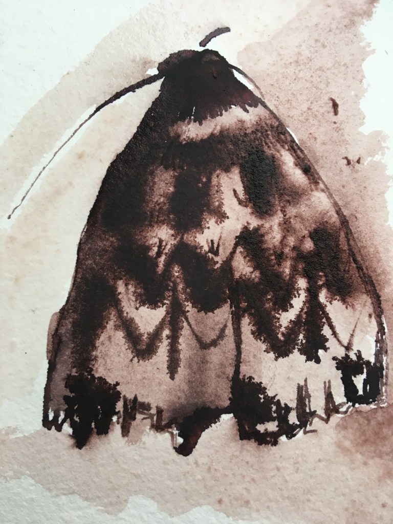 Bij het opschonen was de vondst een nachtuil en een bij, beide dood als een piertje, maar nog volledig intact. Bister en een onbewerkt vel Khadi Papers en de spiksplinternieuwe bamboe rietpennen in de aanslag, wat een gave ontdekking was dit. Wat tekende het met gemak de dikke en de dunne lijnen van mijn vaders schoonhandschrift van vroeger, dik opgaand, dun neer. Mogelijkheden samen met penseel waren te over, maar eerst kwam de ruwe versie ongepolijst op het papier. De bij te dik aangezet. Bister laat zich niet zo snel wegdeppen als inkt of aquarel.