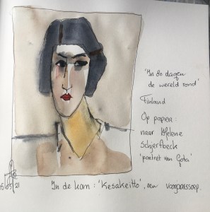 ‘In 80 dagen de wereld rond’ Finland. Op papier naar het werk van Helene Schjerfbeck ‘Portret van Gota’. In de kom: Kesakeitto(Finse zomersoep)