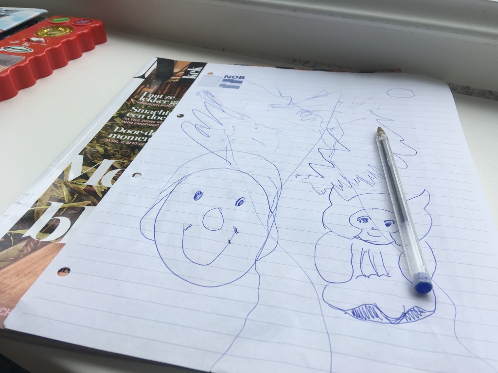 Na de vondst ging ik op weg naar Dribbel, op wie ik een uurtje zou passen. Grote broer was ook thuis. Hij kwam net uit zijn middagslaap en had er maar weinig fiducie in. Ik liet hem begaan en juist dat maakte nieuwsgierig. Hij kwam steeds dichterbij, tot hij op een foto van een schoolblaadje pikachu ontdekte. Met het natekenen van het gele figuurtje, ontdooide hij en wilde ook tekenen. Dat werd een grote dikke slang met, per ongeluk, de vormen van een cobra. Al tekenend en zingend werd het heel gemoedelijk en knus. Grote broer zat diep verzonken in een boek. Verstoppertje spelen met de bank en de kussens. Waar is dribbel nou, o nee toch hij is weg…o, Daar is dribbel. Broer speelde mee. Pas toen het stoeien werd en te hardhandig door de kleine zelf moest de autoracebaan afleiden. Samenspel, ieder een autootje, naar achteren duwen en een twee drie op de knop drukken. Wie het verst kwam. Nog steeds is een kinderhand gauw gevuld. Meer was er niet nodig voor twee uur lering ende vermaeck.