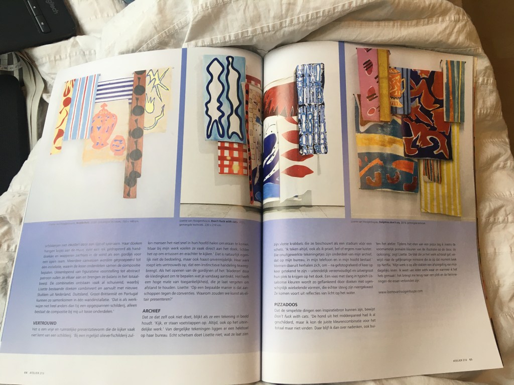 Het blad ‘Atelier’ lag in de bus met uitdagende technieken, die zeer de moeite waard waren om eens uit te proberen. De inspiratie was nagenoeg verdwenen in deze maanden. Het zou goed zijn als iets het weer zou triggeren. Misschien gewoon maar eens met experimenteren aan de gang gaan. Wat ik heel leuk vond, waren de ongekaderde doeken van Lysette van Hoogenhuyze, geïnspireerd door de kleurige was in de Portugese straten hangen ze samen in ceen compositie aan de uur en versterken elkaar door kleur en vorm. Erg gaaf. Zo los te durven werken, uit de bestaande norm, daar kan ik met liefde naar kijken en dat is de wens van de gedachte. Wat let je, spreek ik mezelf toe. Er is altijd dat drempeltje. Maar het linnen staat al op een rol in de kast. Doeken knippen en voorbewerken en gaan. Wie weet. Straks, later, eerst wat nu voor handen ligt. Dat stukje verleden tot leven brengen en-ook niet onbelangrijk- lieve verwonderde kinderkoppies zien stralen. Een meerwaarde.