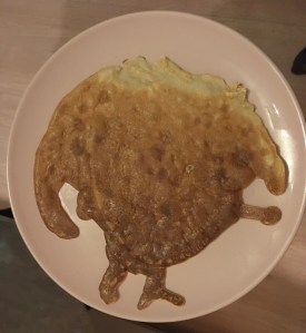 Thuis kon het bakken beginnen. Er waren twee pannen onder handbereik, goed voor een lekkere snelle actie. Schoondochter was perplex hoe rap de stapel groeide. Binnen een klein kwartier kwam de bodem van de beslagkom in het zicht en lag er een stapel naturelle en vijf kaaspannenkoeken te dampen op een bord. Mijn lieve kleine krullebol had de keuze tussen gewone of dinokoeken, omdat de ene pan pootjes en een lange nek toverde aan het beslag dat in de pan ging. Extra feest dus. Zoonlief viel ook inmiddels binnen en twee stegosaurussen gingen met hagelslag en muisjes en veel smaak naar binnen. Dat stond niet iedere dag voor zijn neus. Na al het lekkers was het tijd voor grensverleggend gedrag. Boeven, grenzen opzoeken, spelen met papa en gooien met blokjes om daarna met een scheef koppie te kijken hoe de reactie zou zijn. Zo hield hij ons bezig, terwijl de Benjamin gevoed werd. Het meegebrachte boek uit de grote collectie van oma, ‘de mega-super-piep-krak-kraan’ werd genegeerd, evenals de opdracht om rustig een boekje te lezen. Tien seconden op de trap zorgde ervoor dat hij als een blad aan de boom omdraaide in een zoet spelend modeljongetje. Het vertrek van mij hielp ook daarbij.