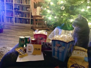 Het gesprek kabbelde voort en sloeg een uur stuk. Tijd om een deur verder te gaan. De doos bleef onaangeroerd tot na de boodschappen. Maar daarna kon het feest beginnen. In feite was het een groot filmpakket bij elkaar. Een te kiezen film, popcorn zoet en zout, zoetigheid, frisdrank, en een kaaszoutje met dip. Dubbel feest door het Vrijwilligershuis. Pluis vond het maar zozo, zonder kattensnoepjes.