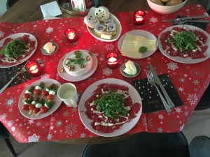 We delibreerden en filosofeerden tot de jongste kleine huiltjes liet horen. Daarna kwam schoondochter al snel thuis en sloeg aan het redderen. Binnen een handomdraai had ze een kerstbrunch uit haar mouw getoverd. Feestelijk en sfeervol rood, compleet met kaarsjes zaten we om tafel. Het was heerlijk, de gekozen klassieke carpaccio en het verse stokbrood. Grote broer had de kerstmannetjes met groene basilicumblaadjes helpen prikken en keek vergenoegd naar de vrolijkheid op het bord. Alle zoetigheden waren voor hen met de andere twee kerstdagen indachtig. Dikke sneeuwman- donuts en kersttompoezen.