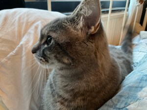 Pluis wringt zich tussen mij en het toetsenbord, maar gaat uiteindelijk aan mijn zij liggen. Even warmen aan wat persoonlijke aandacht van de vrouw.