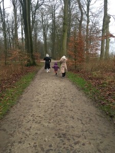Een klein rondje over het landgoed, een groet aan de geitjes, waarbij de enige witte dacht een kans te wagen toen het hekje open bleef staan. In een wolkje boven zijn hoofd stond geschreven ‘ Een raam naar de vrijheid’ en hij voegde de daad bij het woord door hard op de opening af te stormen. Net op tijd deed zus van schoondochter het hek weer dicht. Angstig vloog kleindochter, bij het zien van die opvliegende baal witte wolligheid, achter mijn benen. Het hield op met zachtjes regenen en nu vielen zware druppels loodrecht naar beneden. Maar als vrouwen van stavast lieten we ons niet van de wijs brengen. Sjaals over het hoofd en dwars door het bos, waar de bomen nog enigszins beschutting boden.