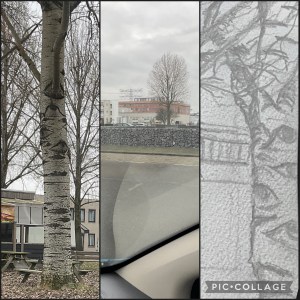 Dat alles werd gistermorgen in gang gezet en daardoor moest ik, lichtvoetig als het voelde, de gang erin zetten om op tijd op de plek van de auto-sketchcrawl te zijn. Het bleek een industrieterrein. Tussen de futuristische gebouwen stonden ijzeren dametjes verheven boven alles uit te torenen en hadden de lijntjes van het elektriciteitsnet in handen. Het koffiehuis in een klein park met grauwe abelen, hun ogen strak of in verwondering op ons gericht, had de naam Savannah. De eigenaar, die bezig was te bevoorraden en in en uitliep, keek argwanend naar mijn verrichtingen en je zag hem denken: ‘Wat moet dat mens, dat zo naar mijn toko aan het staren is’. Kale bomen tekenen is geen sinecure, met hun wirwar aan takken, een titanenklus van de eerste order. Fijn om sinds lang weer eens een potlood vast te houden. De fineliner liet ik voor wat het was. Vanuit perspectivisch oogpunt was het een hele kluif. De lokatie, het parkeerterrein en in de auto met een gezellig muziekje eronder, was een luxe aan warmte.