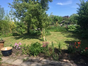 Al vroeg naar de tuin, boodschappen mee, het stokbrood was al op of nog niet gebakken, dan maar bolletjes, kaas en sla. de meegenomen Ipad niet open gehad om te schrijven. Broer en schoonzus van lief bellen en de tuin laten zien met ingehouden trots, we zijn al zo’n eind opgeschoten, maar verder bleef het die dag bij gemoedelijk kouten onder de appelboom van Vasalis met dochterlief en schoonzoon, terwijl de twee jongsten gingen helpen bij het schoonkrabben van de tegels achter het atelier.