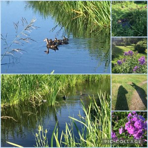 Het was een drukte in de sloot van jewelste. Fuut kwam op bezoek bij het ouderpaar meerkoet en hun twee kleintjes. Hij bleef opvallend in de buurt zwemmen en als pa meerkoet hem te lang aankeek, dook hij een poosje onder. Wonderlijk schouwspel. Aan de kant in het gras toefde moeder eend met haar zes pubers al, schatte ik in. Ze doken ras het water in toen we naderden en verdwenen langs de kant in het hoge riet om pas weer in de volgende sloot tevoorschijn te komen.