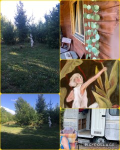 We schoven met ons borreltje, een koud Belgisch biertje en een een even koude witte wijn, naar verschillende schaduwplekken in de tuin. Eerst de fluweelbomen, te weinig wind door de dikke juniperus-struik ervoor. Daarna achter de boeddha met uitzicht op de oude caravan die dienst deed als schuur voor het kleine tuingereedschap en toen zelfs voor de caravan met uitzicht op het beeld van de nimf met de kruik. Dat was eigenlijk een fonteintje, maar helaas had ze dat genoegen nooit mogen smaken. Wat verweerd stond ze er te staan, vertrouwd wit baken in het groen. Ik nam een foto van lief in de stoel, haha, Pa op de camping, zo oogde het. De foto’s appte ik door aan dochterlief. Volgend voorjaar staan ze hier waarschijnlijk een paar weken met hun caravan en wie weet, viel de onze op te knappen tot extra tuinhuisje annex slaapplek.