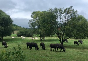 Als we alles uitgebreid bekeken hebben en in het wildrestaurant een Hongaarse goulashsoep hebben gegeten, die gek genoeg waterig en zonder uien of paprika’s was, maar wel smakelijk genoeg, gaan we niet linksaf naar de weg maar proberen het weggetje rechts. Dat bleek een beste keuze. Daar kwamen we pardoes een kudde waterbuffels tegen samen met een kudde puszta-runderen, de lichtgrijze soort, een fel contrast met het inktzwart van de buffels. Verderop een kudde paarden, twee hertenkuddes en ten leste nog een kudde ezels. Weliswaar achter hekken maar met de weidsheid van de heuvelige vlakten waar ze op konden draven en volop de ruimte hadden. We reden tot we niet meer verder mochten. Een groot bord achter een slagboom met een rode streep door de auto kon niet duidelijker zijn.