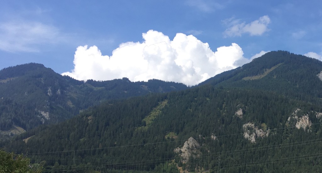 Voor we het wisten was Oostenrijk in beeld, dit keer over de weg naar Salzburg/Linz. De tunnels speelden een spel met ons. Lang, langer, langst en onttrokken een eindeloos stuk landschap aan het oog. Goed verlicht en ruim, behalve die ene tweebaans waar we in de file stonden. Lange rijen auto’s, met handen of armen uit de raampjes en blote voeten tegen de ruit naast de bestuurder om het lange wachten en de warmte te doorbreken. De bergen strekten zich uit, imposant en hoog. Hier en daar, waar regen broeide, hadden de woudreuzen hun lange grijze baarden uitgewaaierd over de dennenbossen. Grijsblauwe tinten erboven, kleurrijk schouwspel.