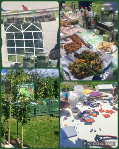 We keken terug op een rijke middag. Er konden namen gebrand worden in twee houten planken, wat later tot een bank zou worden gesmeed door een timmerman. Een in meerdere betekenissen op te vatten ‘Verenigingsbank’. Verder was een oude lelijke tafel toe aan een opknapper. Allen mochten onder het motto ‘Iedereen kan een steentje bijdragen’ werken aan het mozaiek dat gelegd werd met kapotte tegels en met servies dat in de tuinaarde op het complex was gevonden. Scherven brengen geluk en tuinfeesten een vreedzame gemeenschapszin.