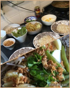 Gisteren heb ik een voorproefje gemaakt van de Vega-soto. Voor de eerste keer zonder soepkip. Het pakte heel goed uit met de vega kipstukjes die ik eerst meegebakken had in de boemboe en die daarna vol en kruidig waren. Waardige vervangers en voor herhaling vatbaar. Zondag dus.