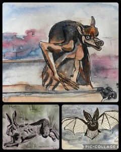 De derde opdracht was ‘Bat’, wat voor mij niet een knuppel maar een vleermuis moest worden. Altijd al vol fascinatie naar de wonderlijke dieren gekeken met een mengeling van bewondering en ontzag. Nooit heb ik ze als griezelig beschouwd. De lieve kleine vleermuizen hier in de spouwmuren heb ik dit laatste jaar niet meer gezien. Dat kan komen doordat ik nu uitzicht heb op de wereld en niet langer op de boom voor het raam. Het kan ook komen vanwege het feit dat men misschien de spouwmuren minder toegankelijk heeft gemaakt door betere isolatie. Het was altijd een belevenis om ze heen en weer te zien vliegen van de muur naar de boom en weer terug. In Verweggistan vliegen ze nog steeds in grote getale rond. Dat is een geruststellende gedachte.