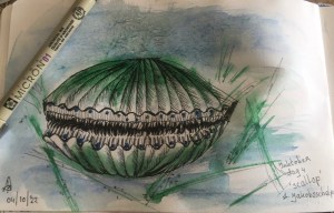 De opdracht van de Inktober Proms van gisteren was ‘Scallop’ dus zocht ik net zolang, totdat ik een mooie foto vond van een Jakobsschelp in zijn natuurlijke habitat. om te laten zien hoe klein de krabbels zijn, leg ik er mijn micro-pen naast. Een trouwe lezer vroeg zich af waar ik de tijd vandaan haalde. Dit was een uurtje werk, alles bij elkaar, het aquarelleren incluis. Daardoor moesten we wat haasten om op tijd bij de fysio te zijn. De stagiair was in ieder geval geslaagd. Nu werd er door mijn eigen peut weer serieus op de ademhaling gelet, wanneer uit en wanneer in. O ja.