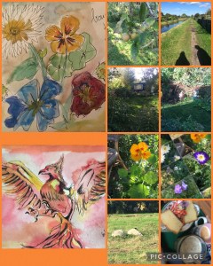 Door de foto’s te bundelen in een collage kreeg ik het idee om de tekenopdracht van Inktober voor die dag ‘Bouquet’ te maken van de tuinbloemen die met hun voeten in de aarde hadden mogen blijven. De dag ervoor was het ‘Flame’ geweest en daar had ik de mooie herrijzende Phoenix voor gekozen. Een van de vriendinnen reageerde met het feit, dat ze dat symbool net even nodig had. Wat een mooie onverwachte wending kan zo’n afbeelding hebben.