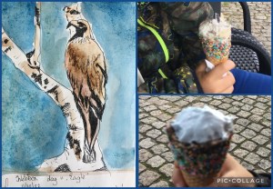 Lief had ik in de ochtend naar de tandarts gebracht en daarna naar het SVB. Thuis lag het schetsboek met de getekende ‘Eagle’, de opdracht van de dag in deze Inktobermaand, die kon nog een finishing touch gebruiken. Even in alle rust in de weer met aquarel. Een klein experiment ondertussen. Andijviestamp met aardappels in de schil. Het bleek een recept dat ik iedereen aan kan raden. Goed wassen en in kleine blokjes snijden, dan koken, boter en melk erdoor, husselen tot de aardappels grof puree vormen en op het allerlaatst de fijngesneden andijvie er door roeren. Het was om te smullen en dat deden we dan ook. Na een enerverende dag is het zoet rusten.