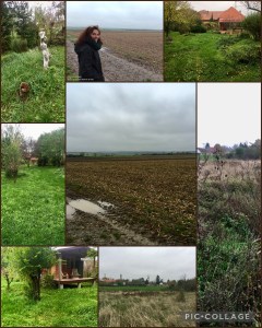 Het is druilerig en nat. De grote maisvelden om ons heen liggen vol met afgekloven mais, de staken steken hompig uit de modder. Het achterland kent hoog gras en bramenstruiken, fijnstralen en zuring, met hier en daar een verdwaalde aster. Er tussendoor lopen allemaal reeën paadjes, zogenaamde wissels, waar wij prima door naar achteren konden lopen. Wel behoedzaam om niet neergehaald te worden door de lage bramentakken, die verdekt opgesteld een echte val kunnen vormen. Zo kwamen we bij het achterste bos aan, dat langs het boerenpad achter onze grond liep. Te modderig om te wandelen, dat is iets voor later in de week. Het uitzicht was weids, nevelig en grauw maar imposant met haar kale akkers zo ver als het oog reikte. Op de terugweg beierde de dorpskerkklok. In het eerste bos ontdekten we een hol, vermoedelijk van een das of een vos. De beelden stonden ongenaakbaar in het druilerige weer. De bomen hadden grotendeels hun blad nog. De walnoot, de pruimenbomen en de rode beuk begonnen te verkleuren. Opvallend was dat de fluweelbomen op het land geel kleurden en niet het vurige oranjerood dat ik van onze volkstuin kende.