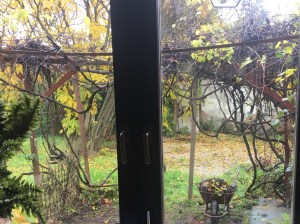 Het heeft geregend vannacht. De tuin en het land liggen er verstild bij, met druppels aan de bladeren, hier en daar een dwarrelend blad, grote druppels van de gesnoeide oude ranken van de druif. Gisterenmiddag zijn we ermee aan het stoeien geweest en hebben ons een weg geknipt door de wirwar van takken. Nu zijn er nog twee aan te pakken stukken over en daarna proberen we het leiden van de takken langs de zijkanten omdat de bovenkant van het prieel het echt wel heeft begeven. Nu de chaos weg is is er ook meer leven. Er fladderde zelfs een late atalanta rond, midden november.