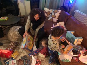 Met twee van die koters onder de drie is bewust en met aandacht uitpakken een gotspe. Zo snel als verantwoord ging alles naar de plek van bestemming en toen alle spanning eraf was, lees uitgepakt, daalde een intense rust neer. Papier mee voor de papierbak thuis, speelgoed één voor één met aandacht bekeken en uitgeprobeerd, de jongste naar bed, en krullebol zoetjes genietend van zijn twee auto’s die ook mee naar bed mochten. Moe maar voldaan lieten we het stel achter. Bedankt lieve schatten, wat een heerlijke after-Sint.