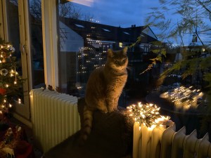 Pluis speelde gisteren in haar eigen Rembrandt-versie. Ze zat bij de kerstlampjes en er ontstond een Claire Obscure waar Rembrandt onmiddellijk op ingesprongen zou zijn, stel ik me voor. Een aanvulling op Minoes, waar we met veel plezier net naar gekeken hadden. Probeer dan maar eens onder de personificatie uit te komen. Een Pluis met karakter.