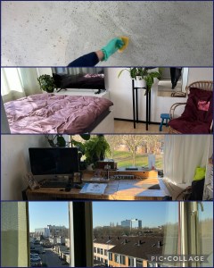 Lief trekt strijdvaardig plastic handschoenen uit de la, de soda, een emmer met warm water en een zachte schuurspons, klimt de ladder op en gaat de schimmel in de badkamer te lijf. Ziedaar, als sneeuw voor de zon. Dat wisten we niet. We hadden het filmpje van onderhoud aan huurhuizen van de wooncorporatie bekeken en daar kwam die duidelijke instructie uit. Werkelijk, wonderen zijn de wereld nog niet uit. We zijn nooit te oud om te leren, dat bleek wel. Ik ontferm me ondertussen over de aankleding van de werkkamer en de slaapkamer. Ineens wordt het omgetoverd tot een eigen sfeer, een rustig zijn. Met de zon erop ziet het er nog mooier uit. Simpele veranderingen kunnen tot grote resultaten leiden.