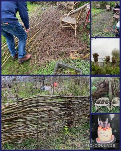 Nu de staken nog. Die werden vernuftigd gevlochten tot een mooi hekwerk tussen buuf en mij. Vlechten is mijn specialiteit en bij gebrek aan een stok voor middenin vrees ik nu wel dat er een nieuwe wilgenboom is geplant. Maar ik weet wat in het vervolg te doen met het overtollige snoeiwerk.Voor de afwerking hadden we de allerdikste staken voor het laatst bewaard, die waren perfect omdat ze over de hele lengte konden.