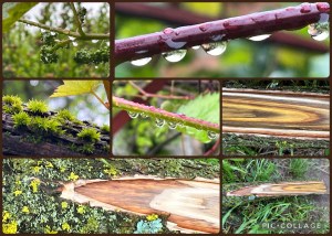 Zon probeert dapper door de dikke grijze deken heen te prikken.. Nu het wat helder wordt zijn de druppels aan de druivenranken kleine opsekopse wereldjes. Met de macrofunctie komen ze prachtig in het vizier. Toevallig leest lief het boek ‘De botanische revolutie’ van Norbert Peeters, over de beschouwingen en de eigen tijd van Darwin. ‘In een notendop’, geeft hij aan, ‘Maar boeiend’. Onder de vijg schiet eindelijk de Oost-Indische kers omhoog. Hoera, straks hebben we bloeiers. Een ander mooi foto-object is de tak die afgescheurd is van de fluweelboom, een fleurige tekening in ringen herbergt de bast en aan de buitenkant tieren de korstmossen welig.