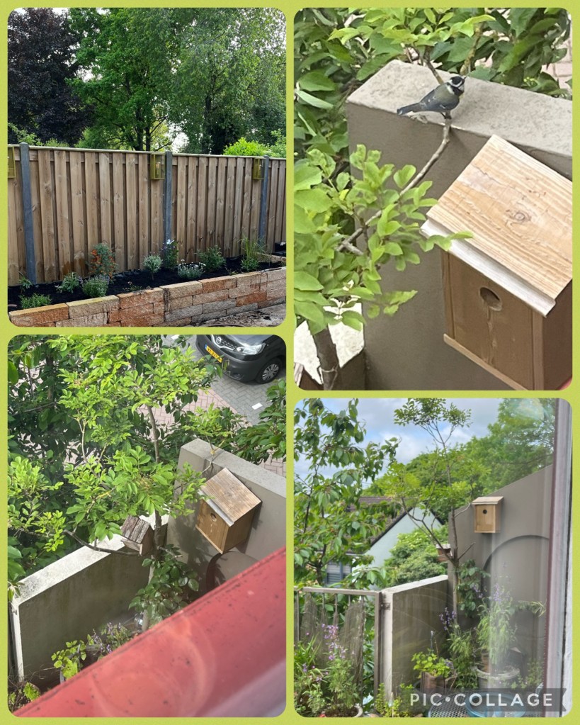 Het was heerlijk om ze allemaal te kunnen knuffelen. Mijn jongste zoon schoof ook naar binnen. Die wilde nog naar de sportschool en zou hier omkleden en douchen. Trots lieten we hem de gezinsuitbreiding zien. Jongen in het nestkastje ven de pimpelmezen. Ze vlogen af en aan en hadden het tot gisteren natuurlijk heerlijk rustig gehad, maar nu waren ze wat zenuwachtig bij al die wonderbaarlijke geluiden. Natuurlijk kwam de groothoeklens erbij, maar de foto was niet goed te maken door te weinig lichtinval. De prunus van de buren zorgde voor een mooi beschutte plek voor de twee kleine fladderaars en hun kroost.