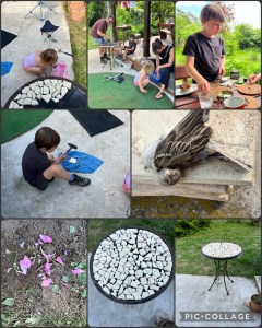 De vorige dag had ik aan dochterlief al geopperd dat de mogelijkheden van een mozaiektafel met het gietijzeren geraamte bij de schuur tot de mogelijkheden behoorde en vandaag ging het hele stel voluit aan de slag. Lief wist op zolder achter een van de schuine deurtjes nog wat antieke tegels van de gevel van het huis en natuurlijk stond er in zijn schuur vol schatten zowel cement als voegsel. De kinderen leefden zich uit door met zonnebrillen op de tafel te prepareren, afbikken van de oude tegels was niet zonder gevaar, pa kwam helpen. Moeder veegde aan en lief fatsoeneerde de tuin. Zo had iedereen een functie. Ik knipte het restant van de te lange druif tot een respectabele en te behappen omvang, speelde met bikkeltje haar honderd-en-een spelletjes en genoot van alle bedrijvigheid. Een kinderhand is gauw gevuld, zeker toen de tegels aan gruzelementen mochten worden geslagen met de hamer en de tafel zich zeker maar gewis vulde met de brokstukken.