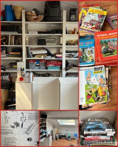 De verzameling stripboeken sorteer ik en leg ze op stapeltjes. Ooit daarmee begonnen in de jaren dat Lief en ik gingen samen wonen in Leiden. Minstens een keer in de week sjouwden we het kleine stripboekenwinkeltje aan de Breestraat binnen, waar twee grote ronde angora-poezenlijven als matrones op de uitgestalde stapels strips lagen en kochten de nieuwste Rode ridder, of de nieuwste Suske en Wiske. Ik maak foto’s, zet ze op de familie-app. Niemand wil ze nog. Verbleekte nostalgie.