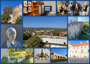 De eerste de beste kamer waar we naar binnen gingen was de martelkamer met zeer beeldende prenten die er boven hingen. Daar hadden we allbei op dit moment niet echt zin in. Mensen hebben elkaar eeuwenlang de meest vreselijke dingen aangedaan. We zijn al dat geweld totaal ontgroeid. Het leven kende op de burcht ook een zekere beschaving toen het in de Habsburgse periode in persoonlijk bezit kwam en daar waren er op de eerste verdieping aangeklede poppen van te zien, met de gangbare kleding al naar gelang de plaats in de rangorde. Een van de mannen had een kostuum aan, die onze dansers in de Hongaarse choreografie ook hadden gebruikt.