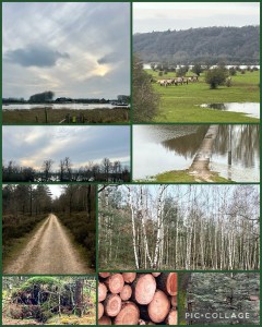 We reden terug langs de oude weg naar Utrecht via Elst en Amerongen en besloten onze wandelpoging bij de Amerongse berg voort te zetten. Bosrijk en nat, maar met verhard pad. De voetgangers een hobbelige en de fietsers een geasfalteerde weg. Zo snoven we de frisse lucht in en genoten van het vochtige mosrijke kalme bos, waarin geen leven te ontdekken viel op een man met een grote hond na. Een tussendoor paadje bleek ook goed begaanbaar. Mooi waren de witte berkenstammetjes, elegant op hun dunne pootjes en de robuuste stapels met gevelde woudreuzen, die lagen te wachten op vervoer. Varens, bomen en grond in groen, zachtogend mos en tussen de rotte bladeren brachten de zware boslucht voort. Wat je heen loopt moet je ook weer terug en waar de weg naar toe zou leiden was ons niet bekend in dit relatief onbekende deel van de berg. Bovendien wilde ik niet klimmen op deze eerste schreden van flinker bewegen. Eerst maar eens gewoon weer het tempo opvoeren en dat ging goed. Met bijna vier kilometer hadden we toch aardig ons best gedaan. Lief had zich gedienstig aangepast aan mijn snelheid.
