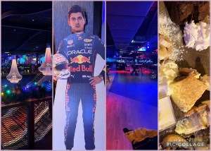 Eerst maar eens een rustig plekje zoeken om te acclimatiseren. Dat was onder een kartonnen uitvoering van Max Verstappen als een reddende engel en zijn ‘echte’ race-auto. Hét podium voor formule-1 fanaten, die het bewijs in hun zak wilden hebben, dat ze de auto hadden aangeraakt en hele gezelschappen die aan mij steeds vroegen of ik hun foto’s wilden schieten. Dat zorgde voor wat afleiding voor die kakofonie van geluiden, in de heen en weer flitsende lichten, getik van de stokken tegen de golfballen, de machines met hun eigen grondtonen en daarnaast ook nog de schreeuwerige kerstverlichting. Hoe chaotisch wil je de tijd tot je nemen.