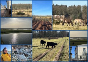 Het bleek om een gebied te gaan, waarbij de ingang niet was waar de tomtom ons heen bracht. Daar slechts een woonhuis, beschermd gebied en geen parkeermogelijkheid. Iets terug voor de brug was wel een parkeergedeelte en de officiële ingang van het park. ‘Zoekt en gij zult vinden’. Het was weliswaar spitsroeden lopen tussen de vele vijgen op de grond maar het cadeau wat daarvoor in de plaats kwam was wonderschoon. Natuurlijk speelde het weer daar een belangrijke rol bij. Stralende blauwe lucht en een al verwarmende zon. Weinig wandelaars en mooie paden. Het mooiste cadeau, want al zo lang niet meer gezien, was de grote populatie huppelende konijntjes die dankbaar van de bramenbosjes her en der gebruik maakten en soms parmantig rechtop de oren spitsten.