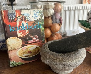 Al gauw kwam er een klein Indisch Kookboek naast het lijvige Libelle-werk te staan en begon mijn geëxperimenteer met al die nieuwe kruiden en exoten die steeds vaker in de schappen lagen en zeker te verkrijgen waren bij de toko in een steeg van de Breestraat. Het was te danken aan het kwart aan Indonesisch bloed dat Lief had meegekregen van zijn vader. We kochten een gietijzeren Wadjan en een natuurstenen Tjobek, een rib uit ons arme studentenlijf. We hadden op een gegeven moment in betere dagen zelfs een abonnement op TongTong en bezochten ieder jaar de grote Pasar Malam in den Haag.