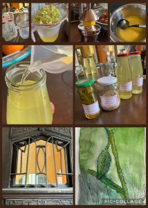 De vlierbloesem heeft de hele dag en nacht in de koelkast in ongeveer een liter water gestaan en vanmorgen mocht het mengsel door de zeef. Een liter kwam er moeiteloos uit, maar het laatste was bevroren. Dat is een euvel van deze koelkast. Hij staat op de laagste stand maar op het bovenste plateau vriest het. Nu staat het te ontdooien. Of het wat afdoet aan de smaak zal Lief straks weten. Mijn reuk en smaak zijn helemaal weg. Ik ruik soms nog vaag, bijvoorbeeld de bijenwas waarmee de oude originele voordeur, waar een nieuwe voor is gezet, werd behandeld. De vlierbloesemgeuren, die ik me herinner als een zachte geurende lente, ruik ik ook niet meer. Zelfs het sterke knoflookaroma, waar ik zo van hou, is verdwenen. Lief zei gister bij het frituren dat de deur of het raam open moest. Maar ik heb niet in de gaten dat de keuken op zo’n moment vergeven is van de baklucht.