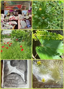 Nadat ik gisteren mijn blog geschreven had, werd er hier hard op de deur gebonkt en Jona Pot geroepen. Lief snelde vanachter uit de hof naar het hek en het bleek de pakketbezorger te zijn, hij had niet de bedbank bij zich maar wel een pakje voor mij. Nou ja, een pakje…zeg maar pak en zwaar en prachtig versierd waarin ik de schilderkunsten van mijn lieve tante Pollewop herkend. Het bleek een echte moederdagdoos te zijn vol met kleine attenties, kattebelletjes, ontroerende brieven, tekeningen en schilderwerk van de kinderen, een gedicht over kletsen en etsen van kleinzoon 2, stroopwafels en Wilhelminapepermunt, een glas in lood om voor het raam te hangen en foto’s, geschept papier om bij het etsen te gebruiken en kaarten, zulke lieve en mooie kaarten. Samen met de herdenkingsdienst in mijn eentje schoot de emotie in pieken omhoog en omlaag, van traan naar lach en terug. Het had geen mooier moment bezorgd kunnen worden. De kinderen, schone kinderen en kleinkinderen zo dichtbij te voelen ook al ben ik zo ver weg is een heel intens houden van. Onze wereld. De wereld van John Lennon in een notendop, de voelbare geborgenheid.