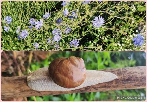 Lief houdt me op de hoogte van de perikelen in Nagypeterd. De slakken zijn los nu regen en afkoeling ook daar haar best doet, om de dorstige natuur een handje te helpen. Er komen foto’s langs van wilde Cichorei en lange slijmerige bleke-betten-slakken met wiebelende huisjes op hun rug. De juf in mij wil dat kinderen hun tocht volgen langs het slijmerige spoor. ‘Slakken zijn knappe beesten,’ vonden wij en daar waren we als groep eensgezind in, ‘Want ze kunnen tekenen. Pak maar een zwart papier en zet de slak ergens aan de rand.’ Die experimenten hebben we veelvuldig uitgevoerd.