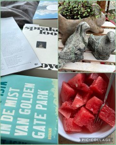 Lezen probeerde ik gisteren ook. Een stukje Tom Lanoye en een stukje Murat Isik, maar het koste moeite om de aandacht erbij te houden. Steeds betrapte ik me op een staren in het oneindige of op het feit dat, dwars door de te lezen zinnen heen, de tuin doorsijpelde of Lief en het vele werk in de tropenhitte. Er is daar namelijk een hittegolf gaande met temperaturen tegen de veertig graden aan. Lief doet het werk in de ochtenduren van vijf tot elf en daarna is het vooral verkoeling zoeken op schaduwrijke plekken of in het huis, dat met haar dikke muren de warmte prima buitensluit.