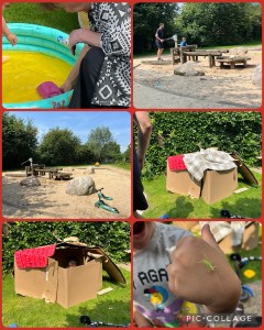 In de tuin bouwden we van de kartonnen een tent, theedoek en hemd van papa als dak erover, klaar is Kees. De oudste tevreden, de middelste een beetje gespannen. Gelukkig kwam er een kleine lichtgroene sprinkhaan langs. Dat moesten ze wel even bestuderen. Grote hilariteit als hij van arm naar arm sprong. Helaas verloor hij daarna bij het vangen door kleine graaihandjes twee springpoten en dat was wel zielig vonden ze. Toen ze zoetjes met het beestje in de tent zaten, werd het tijd om op te stappen. Dag lieverds tot na de vakantieweek.