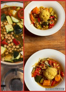Van huis had ik de couscous meegenomen waar ik zo gek op ben. Gekruid en op smaak gebracht met onder andere rozijnen. Maar ook de kruidenkast was geplunderd. Al mijn Indische kruiden waren mee en een aantal zakjes boemboe. In de ochtend had ik al bedacht dat het voor de avond een Marokkaanse couscousschotel zou worden. Een groentestoof van olie, water, grof gesneden paprika, courgette, wortel, tomaat, kikkererwten, rode ui en knoflook. Djahe, ketoembar, kurkuma, djinten en gerookte pittige paprika was het kruidenmelange. Een half uurtje laten pruttelen in de olie, verder laten garen met de deksel op de pan en klaar.