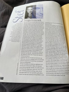 In het zin-magazine schrijft Stef Bos over het verschijnsel ‘loungemuziek’ en hoe ‘de hersenen in een monotone toestand gebracht worden door de zachte basedrum en twee akkoorden.’ Hij voelt zich ‘Als een goudvis in een kom met glas tussen hem en de werkelijkheid’. Die werkelijkheid was namelijk een fantastisch uitzicht op een mooi stukje Nederland, gouden rietkragen aan de einder. De muziek bleek bij het ‘Interior autodesign’ te horen. Bij ‘één pot nat’ dus. Het metselde zijn kop dicht en gaf hem een uitzicht zonder inzicht. De kop van het stukje heet: ‘Vergeetmuziek’ en dat zegt alles.